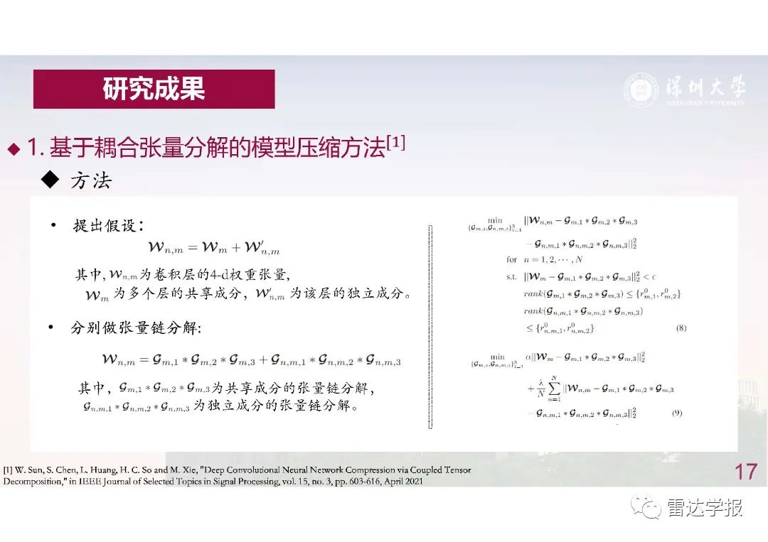 為了解決這個問題,模型壓縮方法應(yīng)運而生。然而,以往的模型壓縮方法只考慮了每個權(quán)重張量的獨立冗余性,壓縮效率較低,且性能衰減較大。為了取得更大的壓縮倍率同時盡可能的保持原始模型精度,我們提出利用神經(jīng)網(wǎng)絡(luò)層間的共性,以耦合張量分解的方法壓縮神經(jīng)網(wǎng)絡(luò),使得不同層共享部分權(quán)重,進一步地壓縮網(wǎng)絡(luò)并實現(xiàn)網(wǎng)絡(luò)推斷加速。
