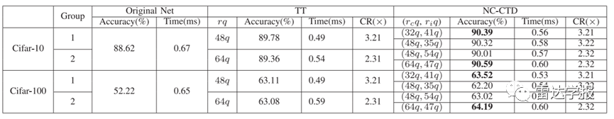 如表1和表2所示,通過利用層間共性,耦合張量分解方法(NC-CTD)在不同數(shù)據(jù)集和任務(wù)上均取得了好于同類算法的性能表現(xiàn),準確率高出基線方法0.5到1個百分點。同時,對比原網(wǎng)絡(luò)的前向推斷時間,NC-CTD方法實現(xiàn)了推斷加速。