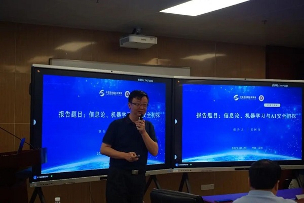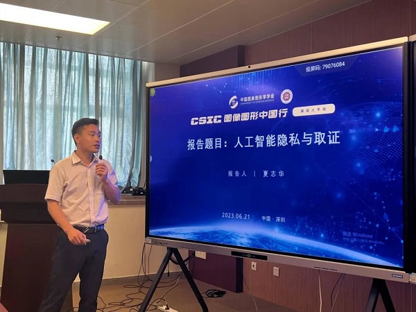 圖 1 李斌教授主持開幕式  圖 2 黃磊教授致辭  圖 3 陳昌盛副教授主持報告  圖 4 楊文元助理教授主持報告  圖 5 微眾銀行范力欣博士作報告 來自微眾銀行范力欣博士作了題目為“模型版權(quán)認(rèn)定——進展與挑戰(zhàn)”的報告。報告回顧了人工智能模型的發(fā)展,展示了生成模型的結(jié)果,以及AI生成侵害版權(quán)的案例,并由此引出了模型版權(quán)認(rèn)定的機遇與挑戰(zhàn)。報告主要集中在模型生命周期與知識產(chǎn)權(quán)保護這個主題上。范力欣博士首先介紹了模型版權(quán)保護系統(tǒng)包含的實體,分析了各個實體之間在模型版權(quán)保護過程中扮演的角色。報告還引出了模型版權(quán)保護的一些存在的問題,包括可證明安全缺失、全生命周期測試框架缺失、AIGC模型版權(quán)保護挑戰(zhàn)、聯(lián)邦學(xué)習(xí)版權(quán)保護挑戰(zhàn)、Trade-off:惡意投毒或者水印嵌入、LLM版權(quán)版權(quán)保護挑戰(zhàn)、IPR功能多樣化挑戰(zhàn)以及法律社會相關(guān)等。  圖 6 暨南大學(xué)夏志華教授作報告 暨南大學(xué)夏志華教授作了題目為“人工智能隱私與取證”的報告。報告從人工智能數(shù)據(jù)隱私角度出發(fā),介紹了AI隱私相關(guān)技術(shù)以及協(xié)議,由此引出了基于秘密共享的非線性函數(shù)sigmoid和tanh的安全兩方協(xié)議,基于此提出基于分治策略的指數(shù)協(xié)議,并將其應(yīng)用于sigmoid和tanh函數(shù)中;接著夏志華老師介紹了魯棒GAN模型水印方案,從已有的GAN模型水印工作出發(fā),引出了夏教授團隊的基于預(yù)訓(xùn)練水印解碼器的GAN模型水印方法;以及ChatGPT生成摘要檢測方法等相關(guān)工作。  圖 7 清華大學(xué)深圳國際研究生院夏樹濤教授作報告 清華大學(xué)深圳國際研究生院夏樹濤教授作了題目為“信息論、機器學(xué)習(xí)與AI 安全初探”的報告。報告回顧了深度學(xué)習(xí)的發(fā)展歷史,引出了第三次AI浪潮下模型大規(guī)模應(yīng)用面臨的機遇和挑戰(zhàn)。接著夏教授介紹了機器學(xué)習(xí)與信息論的關(guān)系,闡述了信息論相關(guān)知識對機器學(xué)習(xí)模型安全的啟示和指導(dǎo)。夏教授重點介紹了AI數(shù)據(jù)壓縮存在的問題,并提供了相關(guān)的解決思路和方法,主要采用了非對稱壓縮和邊信息技術(shù)提升了數(shù)據(jù)壓縮效率,相比JPEG壓縮提升了壓縮率。最后,夏教授介紹了糾錯碼在AI模型安全中的應(yīng)用。  圖 8 哈爾濱工業(yè)大學(xué)(深圳)陳斌助理教授作報告 哈爾濱工業(yè)大學(xué)(深圳)陳斌助理教授作了題目為“面向多媒體檢索系統(tǒng)的安全與版權(quán)保護”的報告。報告首先介紹了多媒體檢索的背景知識和相關(guān)方法,主要包括最近鄰搜索及其替代方案。接著從香農(nóng)信息論出發(fā)介紹了信源編碼的原理,引出了基于深度學(xué)習(xí)的多媒體檢索方法,具體包括了深度量化和深度哈希兩類方法。此外,報告對多媒體檢索方法抵抗對抗攻擊的能力進行了分析,探討了對抗噪聲在視頻檢索的版權(quán)保護中可能的應(yīng)用。報告最后總結(jié)了深度檢索系統(tǒng)未來面臨的機遇和挑戰(zhàn)。  圖 9 南京航空航天大學(xué)薛明富副教授作報告 南京航空航天大學(xué)薛明富副教授作了題目為“深度學(xué)習(xí)模型的主動授權(quán)控制”的報告。報告從深度模型版權(quán)保護的角度出發(fā),對相關(guān)方法根據(jù)嵌入主體和嵌入方式等角度進行了分類。報告接著介紹了主動式模型版權(quán)保護的概念、需要解決的問題以及注意事項。報告具體對基于參數(shù)擾動加密的模型版權(quán)保護方法、基于多觸發(fā)模型的后門攻擊方法、基于隱蔽后門和用戶身份認(rèn)證的主動授權(quán)方法、罕見對抗樣本作為模型指紋的方法、基于樣本相關(guān)后門的主動授權(quán)控制以及用戶指紋追蹤方法和基于可逆空間域?qū)箻颖镜臄?shù)據(jù)集授權(quán)控制方法。最后對面向主動授權(quán)控制的模型版權(quán)保護方法進行了總結(jié)。  圖 10 香港中文大學(xué)(深圳)吳保元副教授作報告 香港中文大學(xué)(深圳)吳保元副教授作了題目為“對抗機器學(xué)習(xí)的統(tǒng)一視角和最新進展”的報告。報告首先介紹了對抗機器學(xué)習(xí)的概念和機理,包括對抗樣本攻擊、后門攻擊和權(quán)重攻擊的區(qū)別和聯(lián)系;并且對對抗機器學(xué)習(xí)范式進行了定義。報告接著對后門攻擊方法進行了分類總結(jié)和歸納,從一種不可見后門攻擊方法出發(fā),介紹了一種魯棒的后門攻擊方法;另外,針對目標(biāo)跟蹤任務(wù),介紹了相應(yīng)的后門攻擊方法,并且取得了很好的視覺效果和魯棒性;報告還介紹了面向3D點云分類任務(wù)的后門攻擊方法。報告接著介紹了后門攻擊相應(yīng)的防御方法,包括了從模型訓(xùn)練過程、特征空間和訓(xùn)練數(shù)據(jù)角度出發(fā)的相關(guān)方法。最后,報告對后門攻擊和防御方法進行了梳理總結(jié),提供了相關(guān)的開源工具。  圖 11 上海大學(xué)吳漢舟副教授作報告 上海大學(xué)吳漢舟副教授作了題目為“頻域可解釋性黑盒模型水印”的報告。報告首先對模型水印基于驗證方式的不同進行了分類,重點介紹了黑盒模型水印的基本框架。報告針對在空域嵌入