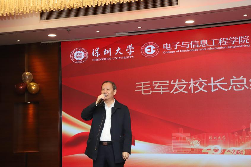 頒獎儀式結束后,在熱烈的掌聲中,中國科學院院士、校長毛軍發(fā)做了總結講話。毛校長簡要回顧了自己從上海交通大學到深圳大學、到電子與信息工程學院的經歷,感情真摯,引起全體教師的強烈共鳴,全場歡笑聲、掌聲不斷。毛校長總結了過去一年深圳大學的發(fā)展情況,他尤其提到了2023年深圳大學的兩件大事,一是獲批“射頻異質異構集成全國重點實驗室”,二是李清泉書記成功當選中國工程院院士,實現了深圳本土高校“零的突破”,可謂是“破天荒”的大事,為深圳大學“雙一流”建設打下了堅實的基礎。電子與信息工程學院過去一年也是碩果累累,在教學、科研等方面成績斐然,科研經費更是創(chuàng)歷史新高,高達1.8億元,位居全校前列,為新一輪學科評估沖擊一流學院、一流學科打開了良好局面。毛校長鼓勵大家新的一年鉚足干勁、戒躁戒躁、奮發(fā)有為,為電信學院、為深圳大學做出新的更大貢獻!也祝各位老師新的一年身體健康、龍馬精神、龍騰虎躍!