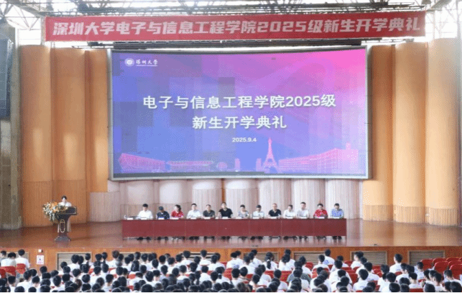 9月5日上午,電子與信息工程學(xué)院2025級新生開學(xué)典禮暨秋季學(xué)期“思政第一課”在深圳大學(xué)粵海校區(qū)演會中心隆重舉行,院長丁文華院士,黨委書記周浩江,執(zhí)行院長黃磊,副院長張勝利、李巖山、黎冰、張沛昌,各系主任鄭能恒、杜戈果、姜梅、鐘世達、教師代表宋超運,新生班主任代表張志朋、盧頔、林華偉、高帥、李偉祥、王蔚昊,新生輔導(dǎo)員及2025級全體新生齊聚一堂,參加開學(xué)典禮。本次典禮由學(xué)院黨委副書記楊丹主持。
