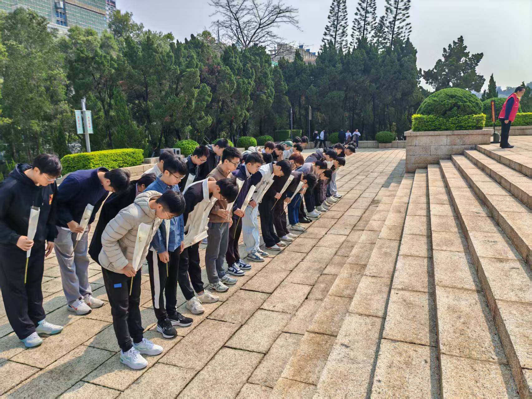 在陵園下,在烈士們面前,黨員們在老師的帶領下集體朗誦了歐震的詩歌《不朽》:“雖然我們已經說不出他們的名字了,但我們知道他們共同的名字,叫——英雄。他們的軀體不朽,已長成了滿山的翠竹青松。他們的靈魂不朽,依然在我們的血液里奔流……”鏗鏘的詩行與陵園的靜默哀思交織回蕩,將對先烈的敬仰化作穿越時空的精神共鳴。