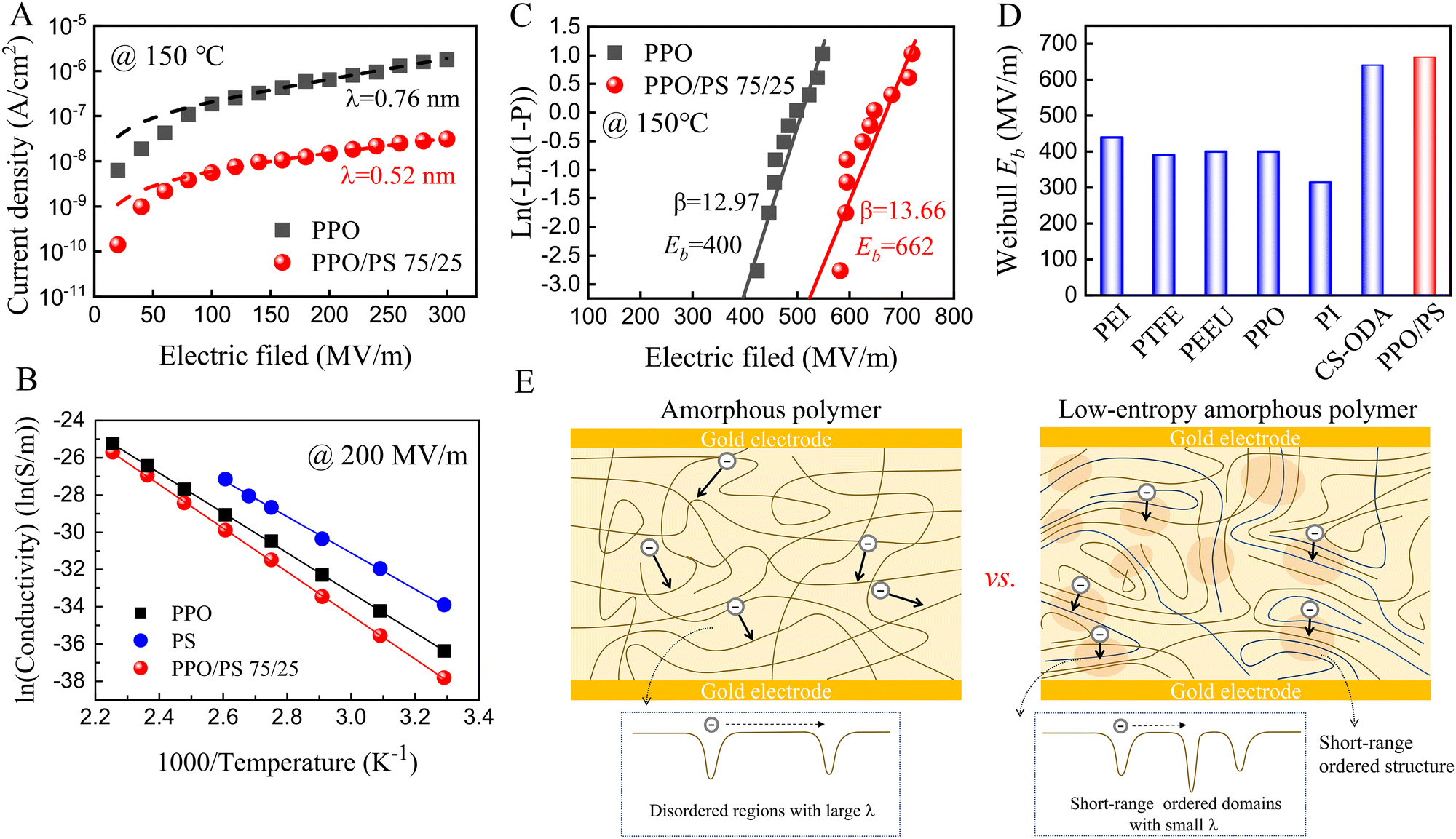 該研究是在前期工作基礎(chǔ)上(Matter,2021,4(7):2448-2459)進(jìn)行的深入拓展,旨在解決薄膜電容器在高溫下漏電流急劇提升的核心科學(xué)問題。研究提出了一種低熵非晶態(tài)聚合物構(gòu)筑策略。該低熵非晶態(tài)聚合物由高玻璃化轉(zhuǎn)變溫度的聚(2,6-二甲基-1,4-苯撐氧化物)(PPO)和聚苯乙烯(PS)分子級共混而成,在高溫和高電場下表現(xiàn)出優(yōu)異的電容性能。材料設(shè)計(jì)原理是利用PS的苯環(huán)與PPO的苯環(huán)之間的強(qiáng)范德華力,在分子水平上“拉伸”主鏈,從而顯著降低非晶態(tài)聚合物的分子構(gòu)象熵,形成隨機(jī)取向但高度緊密堆積的延展聚合物鏈,通過深能級局部態(tài)抑制電荷傳輸。研究結(jié)果表明,該低熵非晶態(tài)介電聚合物在150℃下表現(xiàn)出5.5?J/cm3的放電能量密度和超過90%的充放電效率,性能優(yōu)于現(xiàn)有的介電聚合物,并顯示出放電能量密度的兩倍以上的提升。此外,與其他方法相比,該薄膜加工工藝(即聚合物共混)更簡單、直接且成本低,因此該方法為高性能和高質(zhì)量聚合物薄膜的量產(chǎn)鋪平了道路,這些薄膜在高溫薄膜電容器中具有廣泛應(yīng)用。