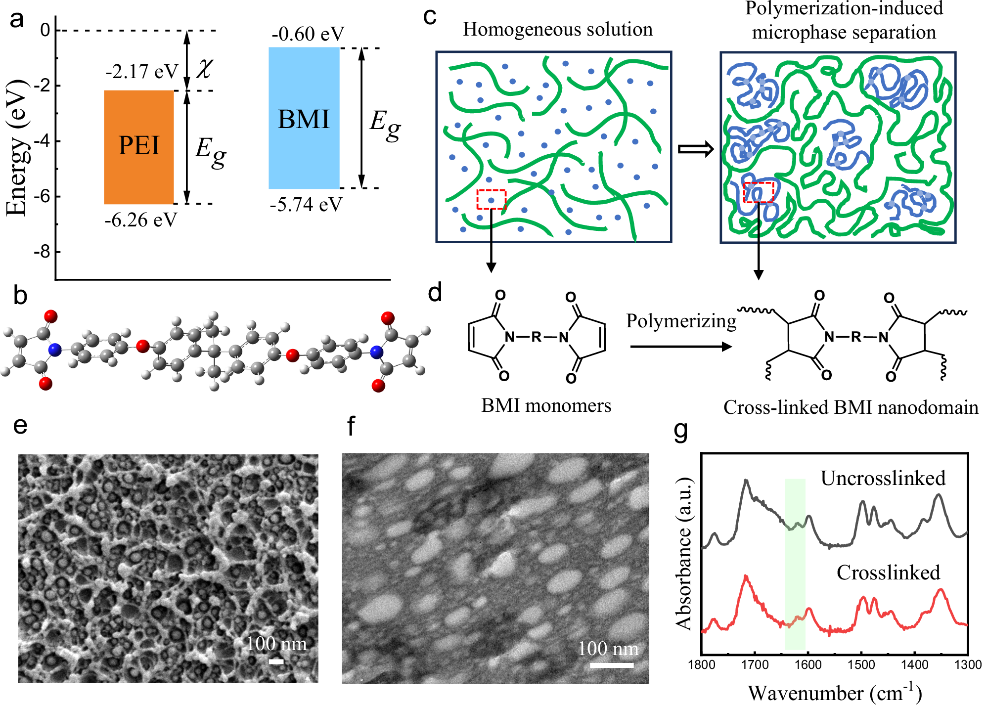 本研究采用聚合誘導微相分離(PIMS)策略,成功制備了高溫全聚合物納米結(jié)構(gòu)電介質(zhì)材料(PNDs),該材料具有良好的可擴展性和低成本優(yōu)勢。基于高玻璃化轉(zhuǎn)變溫度(Tg)的工程聚合物與熱固性樹脂單體在聚合交聯(lián)過程中自組裝形成的納米結(jié)構(gòu)多尺度界面,有效抑制了高溫下電流的產(chǎn)生和輸運,進而使得制備的PNDs展現(xiàn)出優(yōu)異的高溫電容性能。具體而言,聚醚酰亞胺(PEI)被選為高Tg工程聚合物,其高玻璃化轉(zhuǎn)變溫度(Tg ≈ 217 ℃)及良好的加工性為其在高溫薄膜電容器中的商業(yè)應用提供了良好前景。選用的商用雙馬來酰亞胺(BMI)單體(2,2-bis-4-(4-馬來酰亞胺-苯氧基)苯基丙烷)具有較大的帶隙(Eg ≈ 5.74 eV)和低的電子親和能(χ = 0.60 eV),因此能在與PEI接觸時形成較高的電子注入屏障。此外,由于BMI和PEI分子結(jié)構(gòu)中均含有雙酚A和酰亞胺基團,使得二者具備良好的相容性。實驗結(jié)果表明,自組裝的納米尺度多界面結(jié)構(gòu)有效抑制了電荷的注入與激發(fā)。在高溫和強電場條件下,漏電流密度降低了一個數(shù)量級以上,而在150 ℃的高溫下,擊穿場強提升了30%,顯著優(yōu)于純PEI。該全聚合物納米結(jié)構(gòu)電介質(zhì)材料在150 ℃下實現(xiàn)了7.1 J/cm3的放電能量密度和90%的充放電效率,超越了現(xiàn)有的聚合物電介質(zhì),并且其放電能量密度相比純PEI提高了超過兩倍。此外,與文獻中報道的方法相比,本研究的薄膜加工過程更為簡單、直接且成本低廉,為高性能、高質(zhì)量電容薄膜的大規(guī)模生產(chǎn)奠定了基礎。