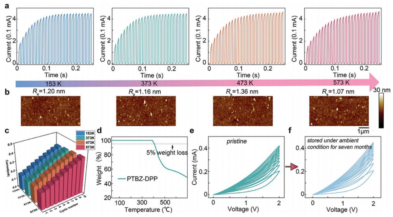 圖2. PTBZ-DPP憶阻器的溫度和環(huán)境穩(wěn)定性測試。
