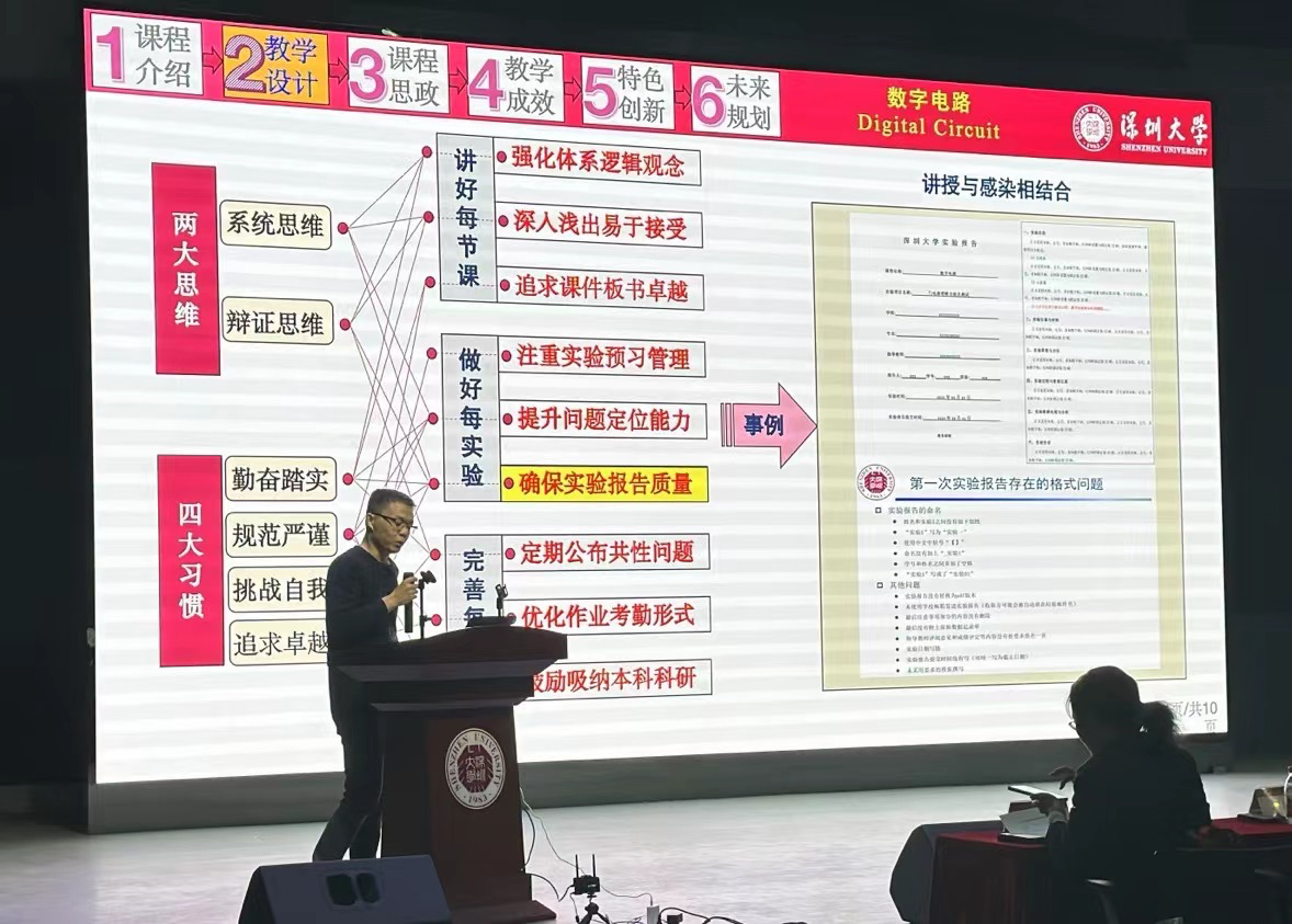 2023年12月29日,深圳大學(xué)電子與信息工程學(xué)院在滄海校區(qū)致理樓L3二樓演播廳舉辦了第一屆院長教學(xué)獎現(xiàn)場評審會暨頒獎儀式。電子與信息工程學(xué)院院長、中國工程院院士丁文華老師,電子與信息工程學(xué)院黨委書記周浩江老師,教學(xué)督導(dǎo)團(tuán)團(tuán)長孫忠梅老師,教務(wù)處副處長曾明老師,全體參評教師、教學(xué)指導(dǎo)分委員會委員及近百位學(xué)生代表出席。會議由學(xué)院教學(xué)副院長黎冰老師主持。