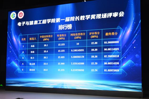 最終,孫磊、張曉、張力老師榮獲“電子與信息工程學(xué)院第一屆院長教學(xué)獎”。丁文華院長為獲獎教師頒發(fā)證書、獎杯及獎金,向他們表示熱烈的祝賀。學(xué)生志愿者為全體參評老師獻(xiàn)花。