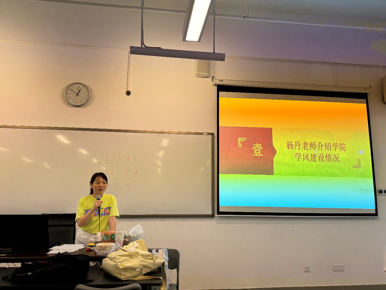 會議首先由楊丹老師介紹學(xué)院學(xué)風(fēng)建設(shè)情況。她著重強(qiáng)調(diào)了良好學(xué)風(fēng)對學(xué)生學(xué)業(yè)發(fā)展的積極推動作用,并介紹了學(xué)院在學(xué)風(fēng)建設(shè)方面的具體安排和措施。她提到,一流的學(xué)風(fēng)是學(xué)校建設(shè)世界一流大學(xué)的必要條件,近年來學(xué)院科研水平和學(xué)科發(fā)展勢頭強(qiáng)勁,同學(xué)們要與學(xué)院發(fā)展同頻共振,明確個(gè)人發(fā)展目標(biāo),在思想上和行動上,把學(xué)業(yè)視為第一要務(wù)。楊丹老師還結(jié)合自身經(jīng)歷分享了她在大學(xué)時(shí)期的學(xué)習(xí)生活,以此鼓勵同學(xué)們積極追求健康向上的大學(xué)生活,不斷提升自我,實(shí)現(xiàn)全面發(fā)展。