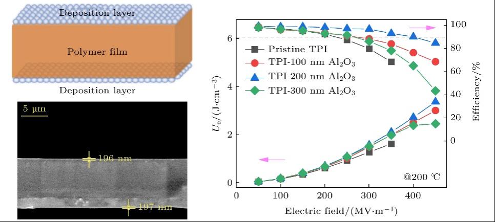 此外,在具有高玻璃化轉(zhuǎn)變溫度(Tg)的熱塑性聚酰亞胺(TPI)薄膜表面采用物理氣相沉積技術(shù)(PVD)沉積氧化鋁(Al2O3)鍍層, 制備了有機(jī)/無(wú)機(jī)三明治結(jié)構(gòu)的Al2O3/TPI/Al2O3電介質(zhì)薄膜。氧化鋁鍍層不僅與TPI之間具有優(yōu)異的界面結(jié)合性, 同樣提高了肖特基勢(shì)壘, 抑制了電極電荷的注入, 從而降低了高溫下的漏電流, 并提高了擊穿強(qiáng)度。制備的Al2O3/TPI/Al2O3三明治結(jié)構(gòu)薄膜在高溫下獲得了優(yōu)異的放電能量密度(Ud)和充放電效率(η)。在150和200 ℃高溫下, η>90%時(shí)的Ud分別達(dá)到4.06和2.72 J/cm3, 相比純TPI薄膜提升了98.0%和349.4%。