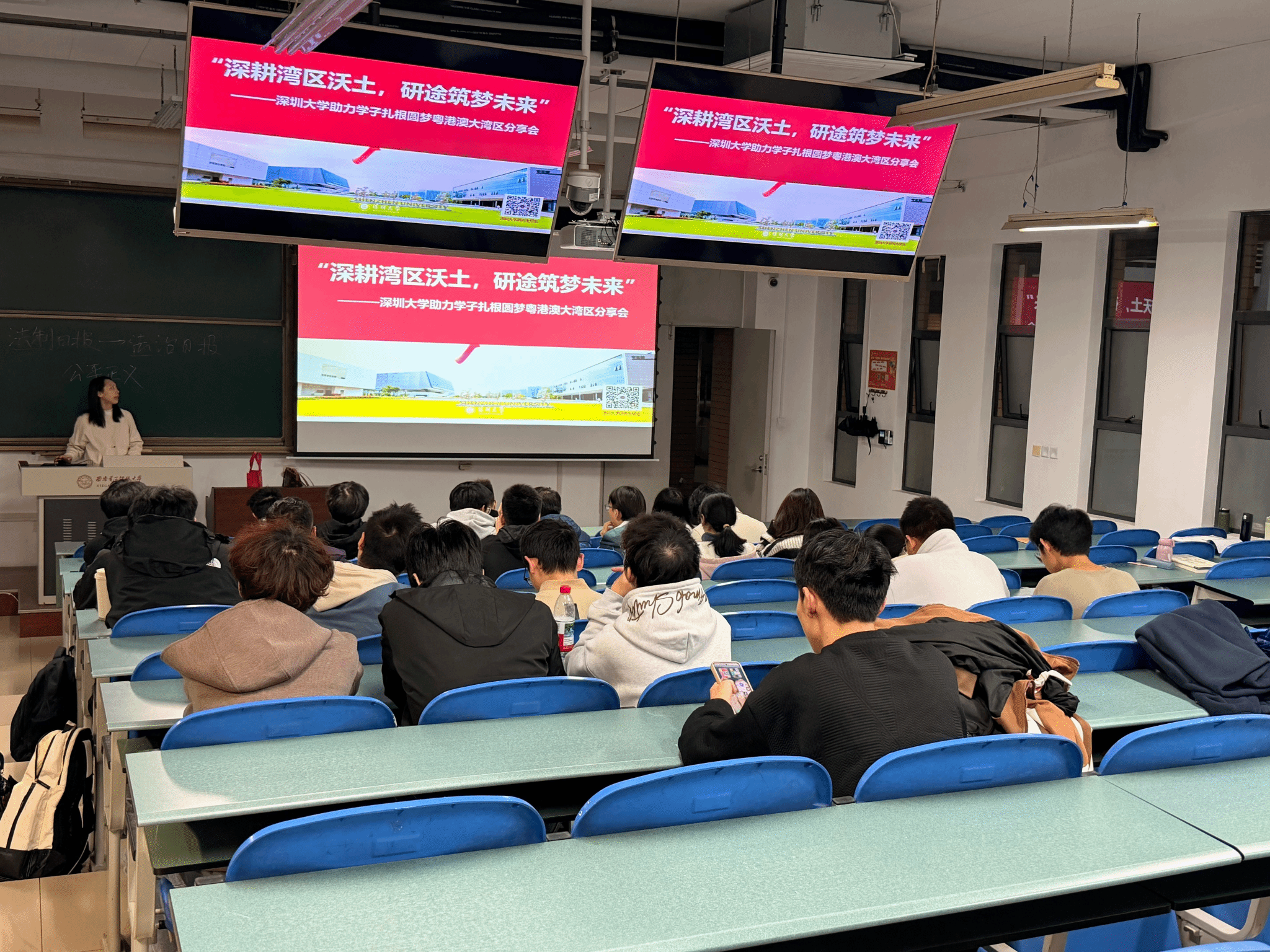 2025 年10月24日下午,深圳大學(xué)電子與信息工程學(xué)院招生宣講團(tuán)走進(jìn)西安電子科技大學(xué)南校區(qū)開展“‘深耕灣區(qū)沃土,研途筑夢未來’——深圳大學(xué)助力學(xué)子扎根圓夢粵港澳大灣區(qū)” 主題分享會(huì)。此次活動(dòng)旨在向西安電子科技大學(xué)優(yōu)秀學(xué)子全面展示深圳大學(xué)研究生培養(yǎng)優(yōu)勢。