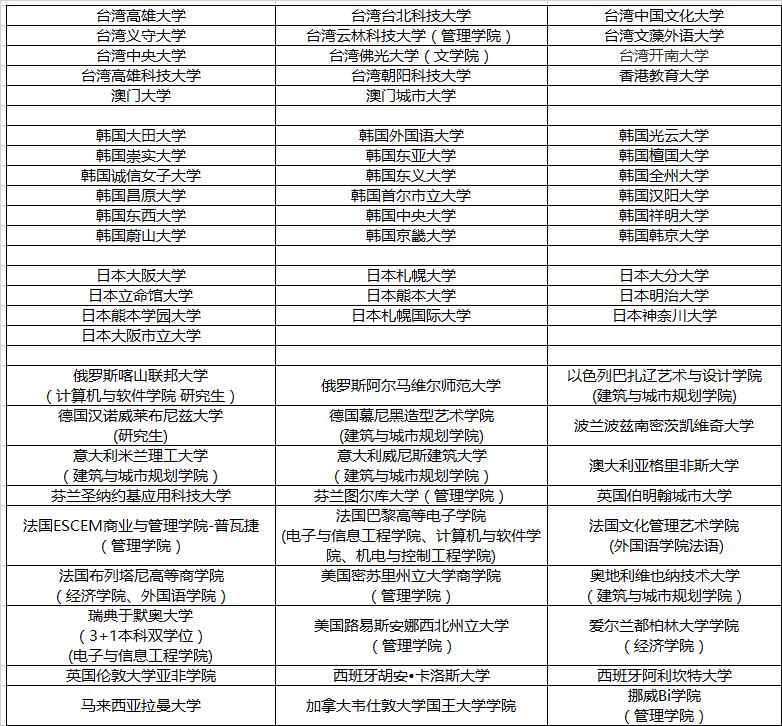 我校攜手境外高校開展本科和研究生聯(lián)合培養(yǎng)的雙學(xué)士、雙碩士項(xiàng)目(主要模式為2+2、3+1,2+1)、參與該項(xiàng)目的學(xué)生只要能順利完成境外高校的學(xué)業(yè),就可獲得本校和外方院校兩個(gè)學(xué)位;另外還有本碩直讀和聯(lián)合博士項(xiàng)目。