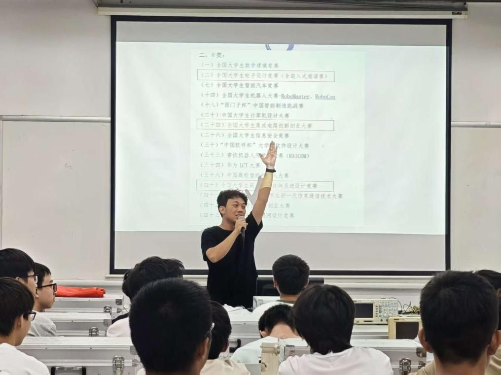 針對學(xué)院主推的賽事,林老師進(jìn)行了重點(diǎn)聚焦與深度解讀。他將全國大學(xué)生電子設(shè)計競賽(電賽)、全國大學(xué)生集成電路創(chuàng)新創(chuàng)業(yè)大賽(集創(chuàng)賽)和全國大學(xué)生嵌入式芯片與系統(tǒng)設(shè)計競賽(嵌創(chuàng)賽)比作學(xué)院為同學(xué)們精心準(zhǔn)備的“三大盛宴”,并指出學(xué)院將為參與這些賽事的隊伍提供強(qiáng)有力的師資指導(dǎo)和資源支持。