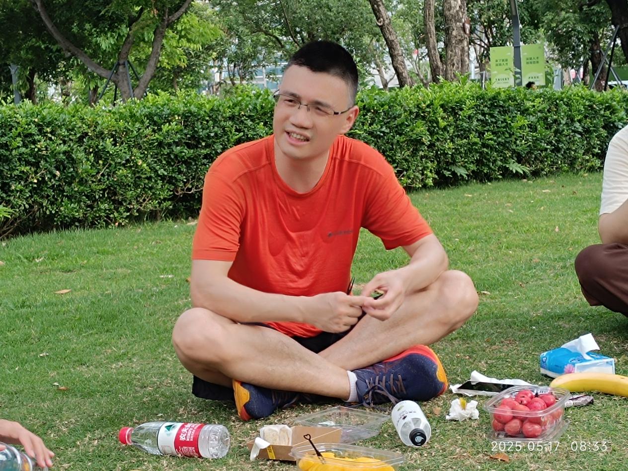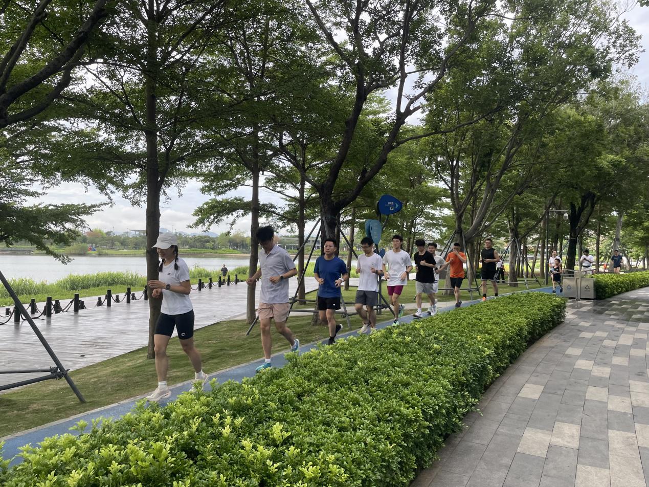活動(dòng)伊始,在跑團(tuán)教練蔣卓航同學(xué)的帶領(lǐng)下,全體參與者進(jìn)行了跑前熱身活動(dòng),包括現(xiàn)場(chǎng)指導(dǎo)跑姿調(diào)整與呼吸節(jié)奏控制,幫助參與者掌握科學(xué)跑步方法。隊(duì)伍沿人才公園湖濱綠道開啟了約5公里的晨跑,途中由2025清遠(yuǎn)馬拉松高校女子組亞軍伍素琳同學(xué)分段領(lǐng)跑并實(shí)時(shí)提示配速。