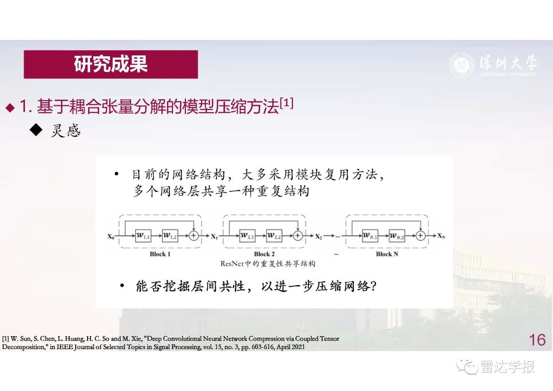 為了解決這個問題,模型壓縮方法應(yīng)運而生。然而,以往的模型壓縮方法只考慮了每個權(quán)重張量的獨立冗余性,壓縮效率較低,且性能衰減較大。為了取得更大的壓縮倍率同時盡可能的保持原始模型精度,我們提出利用神經(jīng)網(wǎng)絡(luò)層間的共性,以耦合張量分解的方法壓縮神經(jīng)網(wǎng)絡(luò),使得不同層共享部分權(quán)重,進一步地壓縮網(wǎng)絡(luò)并實現(xiàn)網(wǎng)絡(luò)推斷加速。
