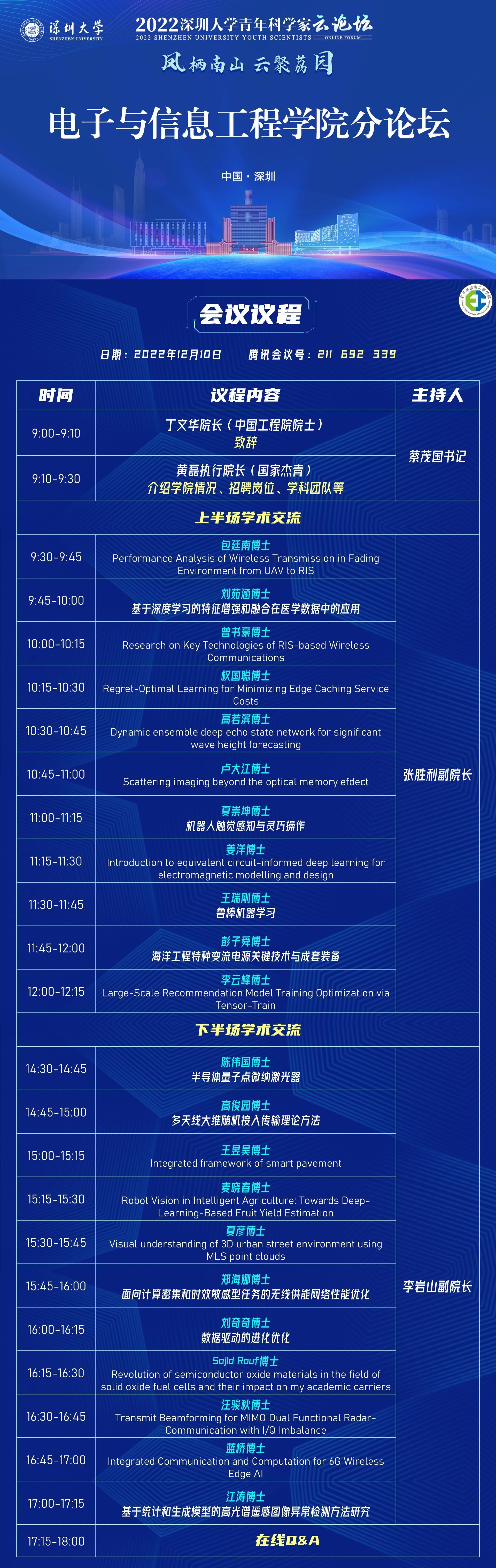 為提升學(xué)院學(xué)科品牌與影響力,加大海內(nèi)外青年才俊引進力度,12月10日,我院順利舉辦了深圳大學(xué)電子與信息工程學(xué)院青年科學(xué)家分論壇。論壇邀請了22位海內(nèi)外青年學(xué)者作學(xué)術(shù)報告,在線觀看人數(shù)達200人。