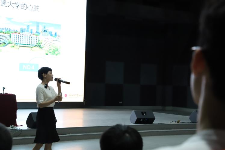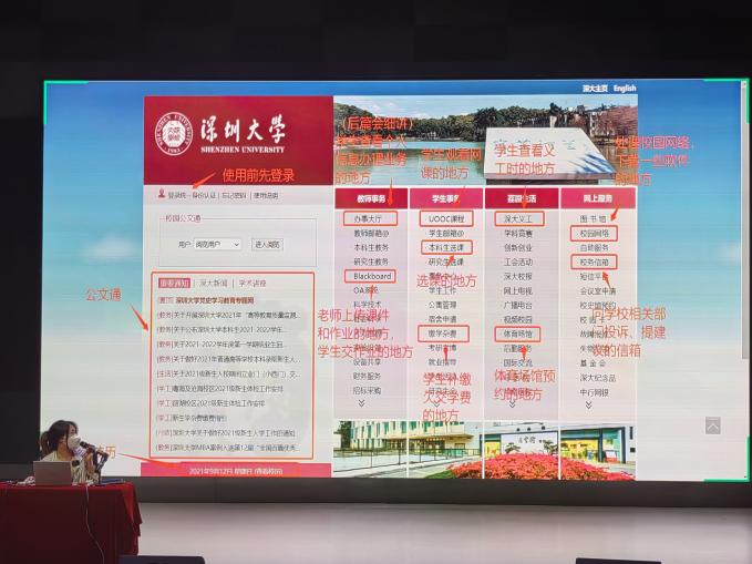 導生主任張露丹向2023級新生介紹了“深大保姆級入門教程”,分APP篇、公眾號篇、小程序篇、內部網(wǎng)篇和交通出行篇五個主要部分講解深大校園生活,幫助新生更好適應校園。