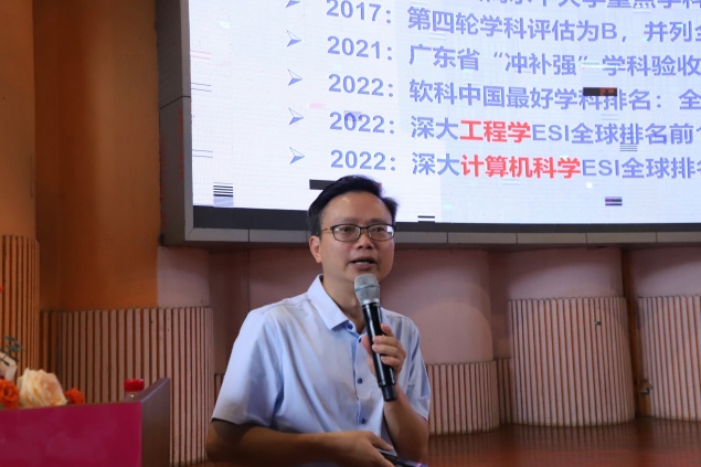 執(zhí)行院長黃磊教授圍繞“本科專業(yè)優(yōu)勢”、“學科體系”、“師資隊伍”、“教學情況”、“國際交流”、“科研平臺”、“全國重點實驗室”等七方面內容全方位、多層次地講述了深大電信學院雄厚的師資力量和一流設施,寄予新生殷切希望。
