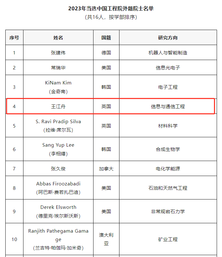 11月23日,中國工程院2023年外籍院士增選名單公布。我院兼職教授、鵬城學(xué)者王江舟當(dāng)選中國工程院外籍院士。