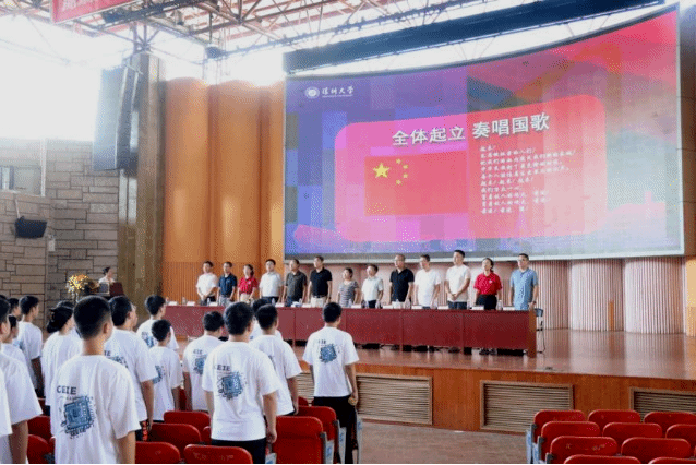 隨后,全體起立奏唱國歌。在莊嚴(yán)的國歌聲中,電子與信息工程學(xué)院2025級本科生及研究生新生開學(xué)典禮拉開帷幕。