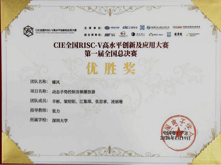 2026年1月17日至19日,首屆CIE全國RISC-V高水平創(chuàng)新和應用大賽全國總決賽在浙江杭州舉行。經(jīng)過激烈的現(xiàn)場角逐,電子與信息工程學院參賽團隊憑借扎實的嵌入式軟件開發(fā)功底和創(chuàng)新的系統(tǒng)設計,從全國眾多高校隊伍中脫穎而出,一舉斬獲國家級一等獎1項、國家級三等獎2項的優(yōu)異成績,充分展現(xiàn)了電信學子在RISC-V開源指令集架構(gòu)領(lǐng)域的創(chuàng)新實踐能力。