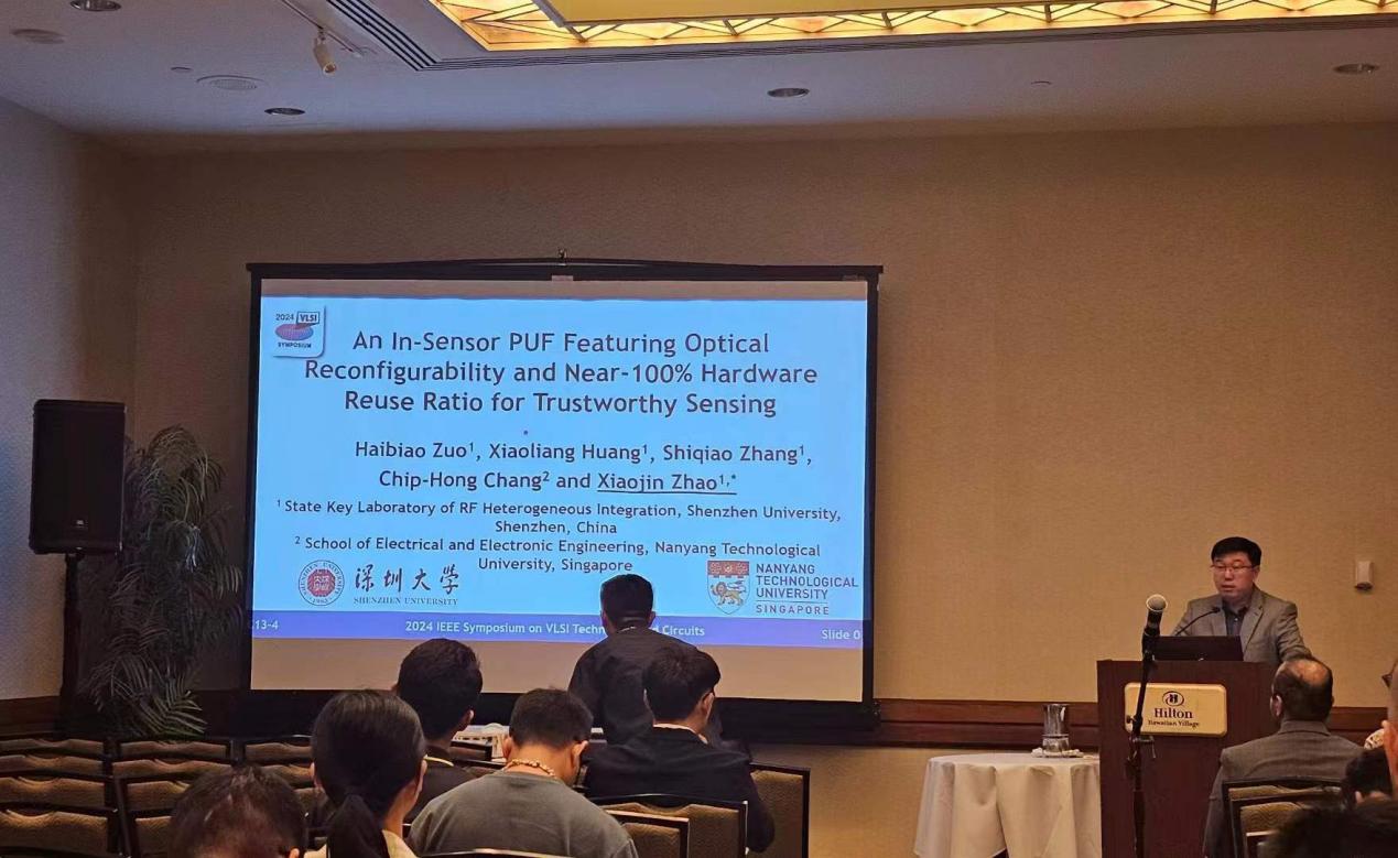 2024年6月16至20日,第44屆超大規(guī)模集成電路國際研討會(huì)(IEEE Symposium on VLSI Technology and Circuits)在美國夏威夷召開,電子與信息工程學(xué)院趙曉錦特聘教授、左海彪博士后赴美國參加該會(huì)議。趙曉錦特聘教授在Symposium on VLSI Circuits分會(huì)的C13 session作報(bào)告,主題為“An In-Sensor PUF Featuring Optical Reconfigurability and Near-100% Hardware Reuse Ratio for Trustworthy Sensing”。該論文的第一作者為左海彪博士后,通訊作者為趙曉錦特聘教授。此論文得到了國家自然科學(xué)基金和國家重點(diǎn)研發(fā)計(jì)劃的支持,同時(shí)也是深圳大學(xué)和射頻異質(zhì)異構(gòu)集成全國重點(diǎn)實(shí)驗(yàn)室在VLSI Symposium上的重要突破。