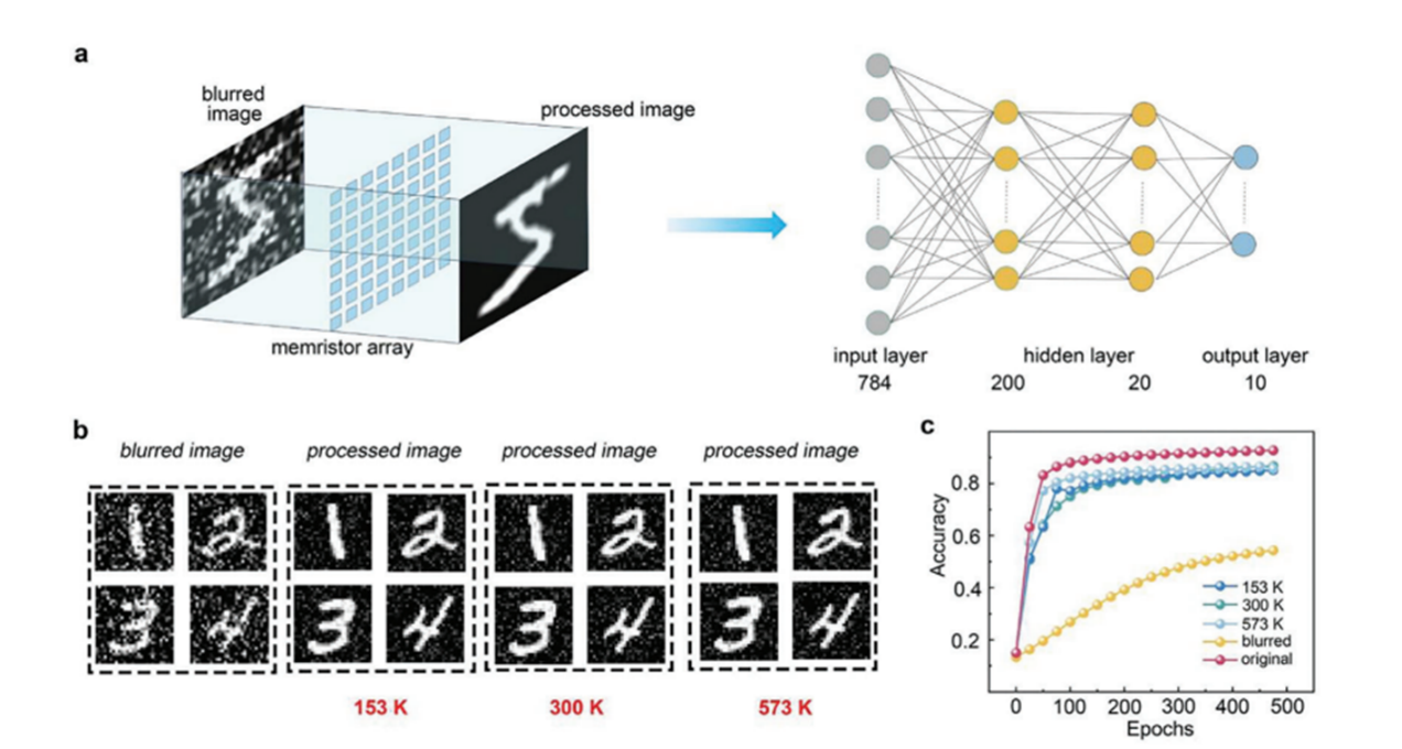 利用憶阻器的閾值開關(guān)特性對模糊圖像進(jìn)行去噪:經(jīng)過器件陣列濾波后不僅顯著提高了模糊圖像的清晰度,并提高了后續(xù)人工神經(jīng)中圖像識別任務(wù)的準(zhǔn)確率(從54.37%提升到了92.78%)。在不同溫度的影響下(153k、300k和573k),使用該系統(tǒng)對圖像進(jìn)行去噪后,準(zhǔn)確率都能提高到85%以上。這些結(jié)果表明,該憶阻器有在極端溫度環(huán)境下執(zhí)行神經(jīng)形態(tài)類腦計算的潛力。