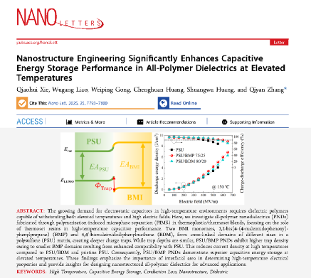 近日,我院張齊艷助理教授在Nature Index期刊《Nano Letters》(影響因子:9.6)上發(fā)表了題為“Nanostructure Engineering Significantly Enhances Capacitive Energy Storage Performance in All-Polymer Dielectrics at Elevated Temperatures”的研究論文。該研究提出了納米結(jié)構(gòu)工程調(diào)控提升全聚合物電介質(zhì)高溫電容儲能性能的研究,揭示了納米界面調(diào)控對高溫電容性能的關(guān)鍵作用機制。深圳大學(xué)電子與信息工程學(xué)院碩士研究生謝巧輝為文章的第一作者,張齊艷助理教授為通訊作者,深圳大學(xué)為第一完成單位和通訊作者單位。
