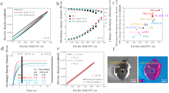 圖2. 全聚合物納米結(jié)構(gòu)電介質(zhì)的高溫電容儲能性能