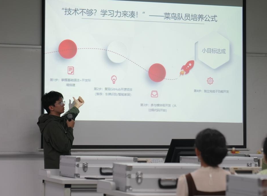 蔡偉杰及其團(tuán)隊曾在集創(chuàng)賽中斬獲國家級二等獎,在其他重大賽事中獲得多個國家級獎項。他結(jié)合自身經(jīng)歷,從個人能力提升、團(tuán)隊協(xié)作、導(dǎo)師助力三方面展開分享。在分享會前的意見征集中,不少同學(xué)表示自己是“賽場小白”,沒有任何競賽經(jīng)驗。面對大家的憂慮,蔡偉杰指出,每個參賽選手都有從零起步的階段,不要擔(dān)心沒有經(jīng)驗,要相信自己能夠?qū)W成。為此,他總結(jié)出了“三步成長公式”,即通過快速學(xué)習(xí)基礎(chǔ)、復(fù)刻優(yōu)秀項目、嘗試自主研發(fā)等三個步驟,基本能夠完成從掌握基礎(chǔ)語法、搭建開發(fā)環(huán)境到獨立完成子功能開發(fā)的一整個學(xué)習(xí)周期。在團(tuán)隊組建和維系方面,他建議使用技術(shù)互補分工法,團(tuán)隊成員按照各自所長分別負(fù)責(zé)硬件開發(fā)、軟件開發(fā)、系統(tǒng)聯(lián)調(diào)三方面工作。這種分工模式不僅能有效滿足不同賽題和不同需求,還能實現(xiàn)“1+1+1>3”的工作效能提升。他還提醒,學(xué)生要多向指導(dǎo)教師請教。導(dǎo)師不僅能在業(yè)務(wù)上提供專業(yè)意見,還可能提供測試環(huán)境、參賽數(shù)據(jù)等重要資源,是競賽團(tuán)隊的“隱形資源”。