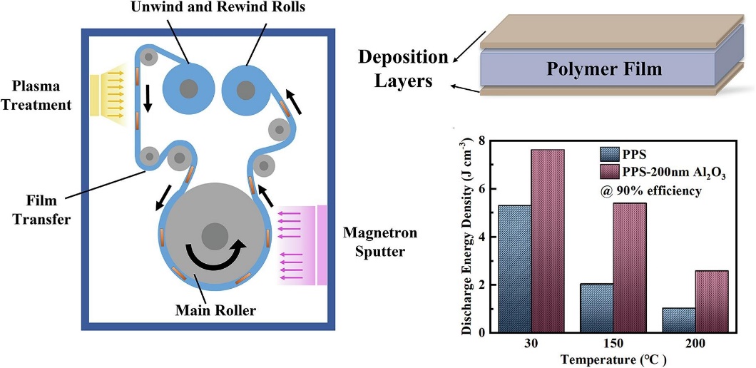 圖1. 卷對(duì)卷磁控濺射工藝制備的PPS/Al2O3高溫電容膜示意圖及其性能表征。