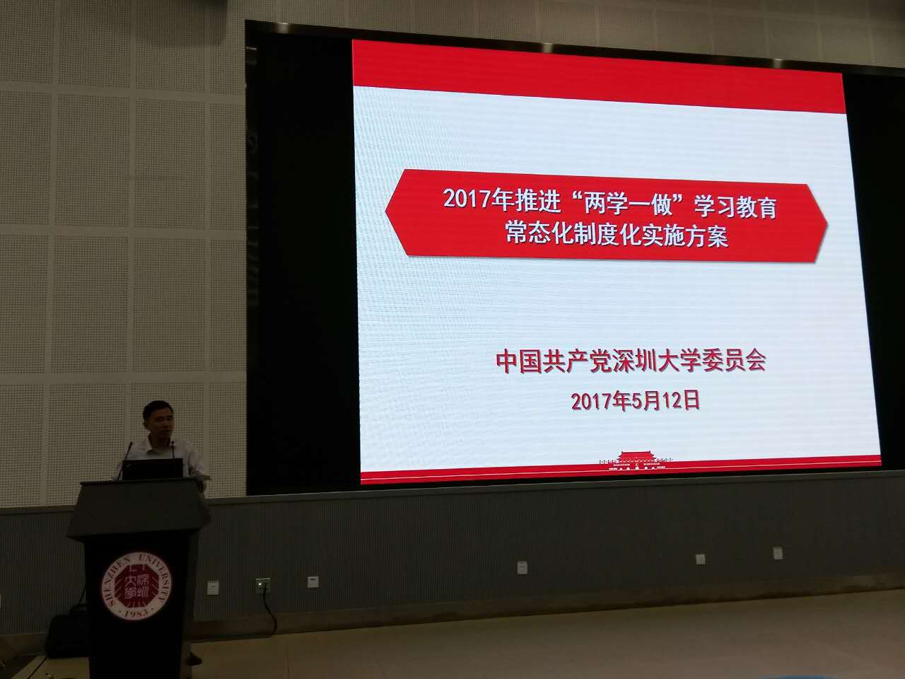 2017年6月9日中午,學(xué)院在電子學(xué)院報(bào)告廳召開全體學(xué)生黨員大會(huì),會(huì)議主題包括學(xué)院黨委書記給全體黨員上黨課、進(jìn)行畢業(yè)生黨員黨性教育等2個(gè)方面。出席會(huì)議的有學(xué)院黨委書記蔡茂國(guó)教授、黨委副書記林志雄老師、黨務(wù)秘書楊丹老師以及全體學(xué)生黨員。 會(huì)上,蔡書記首先傳達(dá)了校黨委關(guān)于推進(jìn)“兩學(xué)一做”常態(tài)化制度化工作的有關(guān)精神,部署學(xué)院落實(shí)“兩學(xué)一做”常態(tài)化制度化的工作,學(xué)習(xí)習(xí)近平總書記對(duì)廣東省工作指示精神,并對(duì)全體黨員提出了新的要求,要求全體黨員聚焦重大意義、目標(biāo)要求和指導(dǎo)原則,把思想和行動(dòng)統(tǒng)一到中央、省委、市委和校黨委的部署上來(lái);聚焦真“學(xué)”實(shí)“做”,以常態(tài)化的態(tài)度對(duì)待學(xué)習(xí)、以制度化的方式推動(dòng)學(xué)習(xí),教育引導(dǎo)學(xué)生黨員踐行“四個(gè)合格”; 聚焦支部建設(shè)和作用發(fā)揮,促進(jìn)支部組織建設(shè)和制度建設(shè);聚焦查找解決問(wèn)題和推動(dòng)中心工作,確保學(xué)習(xí)教育落地見(jiàn)效。接下來(lái)蔡書記為全體黨員做了一個(gè)《自信引領(lǐng)未來(lái)》的專題報(bào)告,蔡茂國(guó)以習(xí)近平總書記提出的“四個(gè)自信”為引線,引導(dǎo)學(xué)生黨員深刻認(rèn)識(shí)我們黨領(lǐng)導(dǎo)中國(guó)革命、建設(shè)、改革取得的輝煌成就,深刻認(rèn)識(shí)黨的領(lǐng)導(dǎo)的歷史必然性和現(xiàn)實(shí)必要性,深刻認(rèn)識(shí)我們黨的性質(zhì)宗旨理論和路線方針政策。從中國(guó)現(xiàn)今的科研力量和成果、日常生活反映的科技水平、工業(yè)技術(shù)水平等方面與美國(guó)進(jìn)行比較,解讀中國(guó)科技實(shí)力正以加速度向美國(guó)逼近,處于世界第一集團(tuán),列舉了大量的事實(shí)和數(shù)據(jù),證明了在中國(guó)共產(chǎn)黨的領(lǐng)導(dǎo)下現(xiàn)今中國(guó)取得的輝煌成就,引導(dǎo)全體黨員堅(jiān)定“四個(gè)自信”,特別是文化自信,希望全體黨員好好學(xué)習(xí),增強(qiáng)黨性修養(yǎng),為實(shí)現(xiàn)中華民族偉大復(fù)興的中國(guó)夢(mèng)共同努力奮斗。 會(huì)議第二階段進(jìn)行畢業(yè)生黨員黨性教育,首先,楊丹老師就今年的畢業(yè)生黨員檔案的轉(zhuǎn)出做了說(shuō)明,希望各位黨員按照所列舉的五類情況選擇相應(yīng)的一類落實(shí)自己的組織關(guān)系;接下來(lái)黨委副書記林志雄老師落實(shí)校黨委的安排,對(duì)畢業(yè)生黨員開展“珍視黨員身份,增強(qiáng)黨性意識(shí)”教育,對(duì)全體黨員在學(xué)習(xí)、生活和工作方面提出了要求和希望,希望全體黨員不辜負(fù)學(xué)校的期望,要時(shí)時(shí)嚴(yán)格要求自己,處處以身作則,率先垂范,以實(shí)際行動(dòng)回報(bào)黨組織的關(guān)懷和信任,發(fā)揮黨員不忘初心跟黨走的堅(jiān)定信念,踐行“兩學(xué)一做”,做到“四個(gè)合格”。 通過(guò)書記上黨課以及開展畢業(yè)生黨員黨性教育,進(jìn)一步增強(qiáng)了學(xué)生黨員的組織性和紀(jì)律性,提升了全體黨員黨性修養(yǎng),同時(shí)也使我們“兩學(xué)一做”學(xué)習(xí)教育常態(tài)化制度化穩(wěn)步推進(jìn),取得成效。