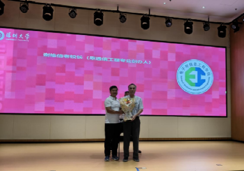 隨后,老師們次第登臺,在笑語中重溫青蔥歲月。謝維信老校長率先發(fā)言,從1997年信息工程學(xué)院初創(chuàng)的艱辛,講到如今學(xué)科體系的完善,尤其提及01級作為通信工程專業(yè)首批學(xué)生的特殊意義。他笑談深大圖書館南北相望的布局,稱其間小徑如“智慧金鑰匙”,指引學(xué)子探索求知;更闡釋了學(xué)院與深圳同頻共振的發(fā)展愿景,最后以“愿君前程似錦,與年輕一代并肩前行”的寄語收尾,溫情滿溢。